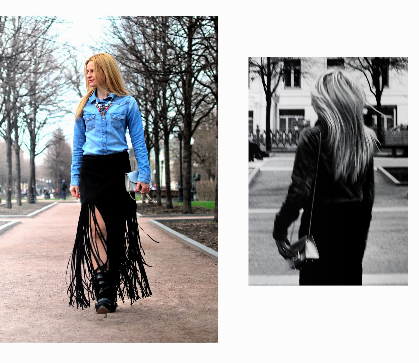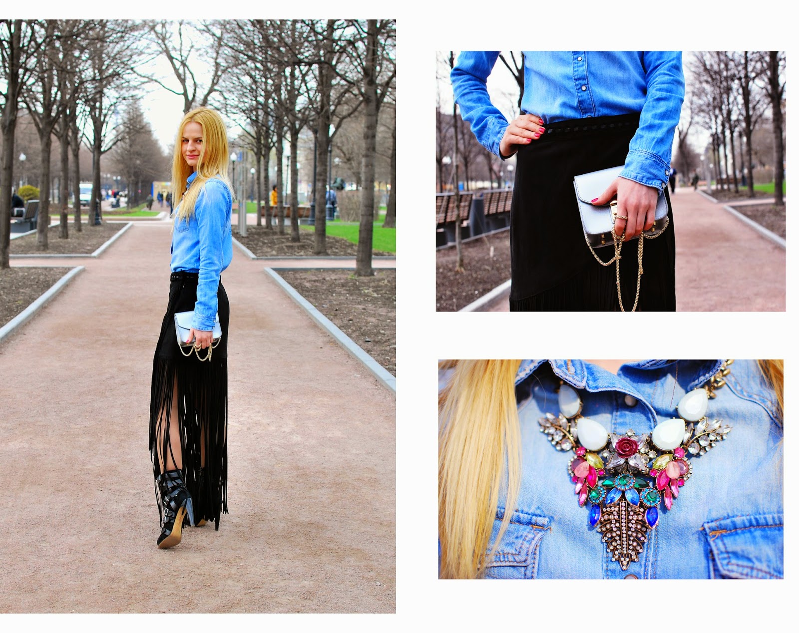 I would advice you to choose a maxi fringe skirt as it’s the best match and doesn’t look lie you go to a beach party. You could pair it with a denim shirt for more informal and easy look. The shirt is always perfect for total denim looks and like an addition to some extra trendy pieces. Just add some accessories and you have nice oufit for evening or any special event. So it’s not that difficult as it looks like in streetstyle photos.